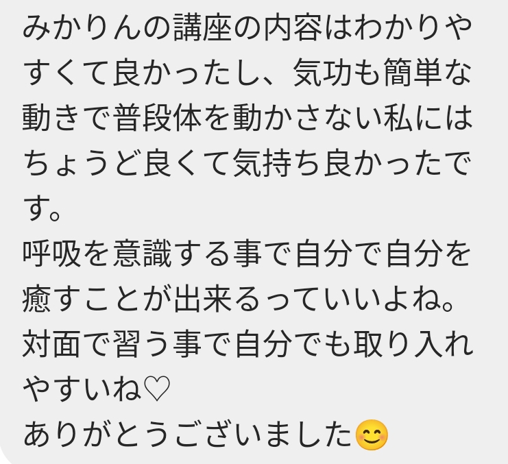 みかりんの講座の内容はわかりやすくて良かったし、気功も簡単な動きで普段体を動かさない私にはちょうど良くて気持ち良かったです。