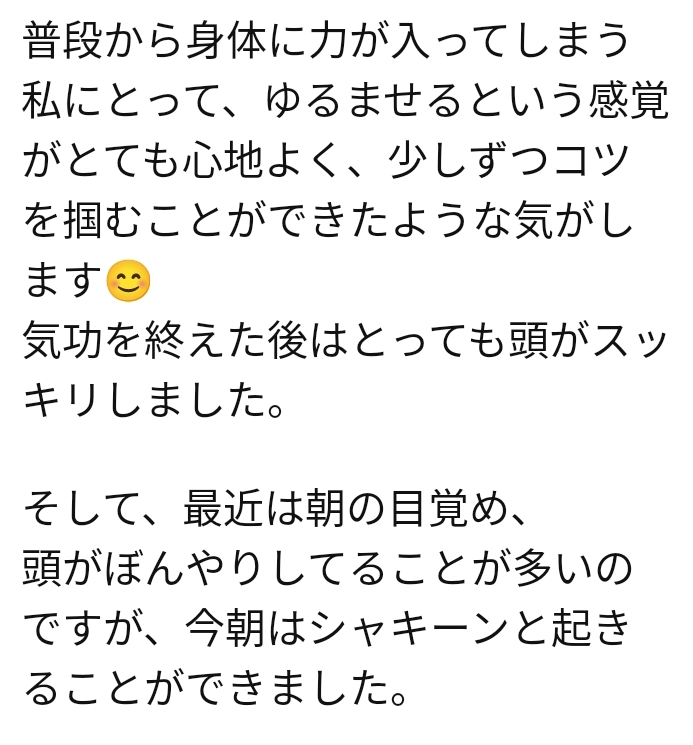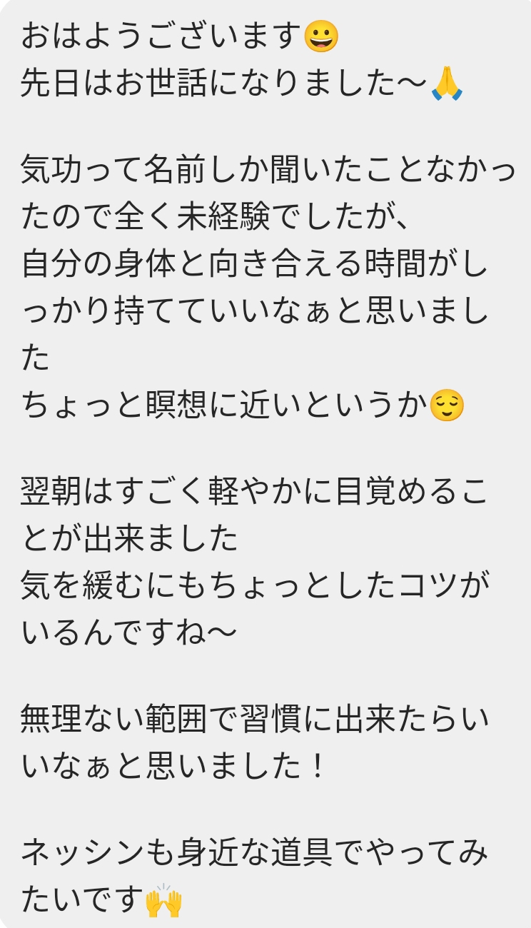 気功って名前しか聞いたことなかったので全く未経験でしたが、自分の身体と向き合える時間がしっかり持てていいなぁと思いました。