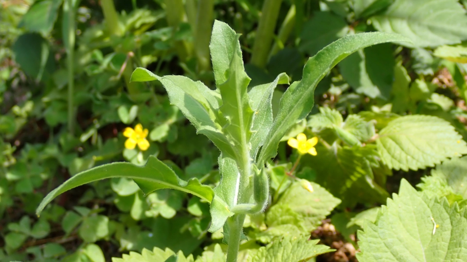 葉については、コマツヨイグサだけが持っている特徴があるようです。それは葉の形が同じでないこと。よく観察してみると葉の切れ込みが一定でなく、ギザギザの葉もあればほとんど切れ込みがない葉もありました。