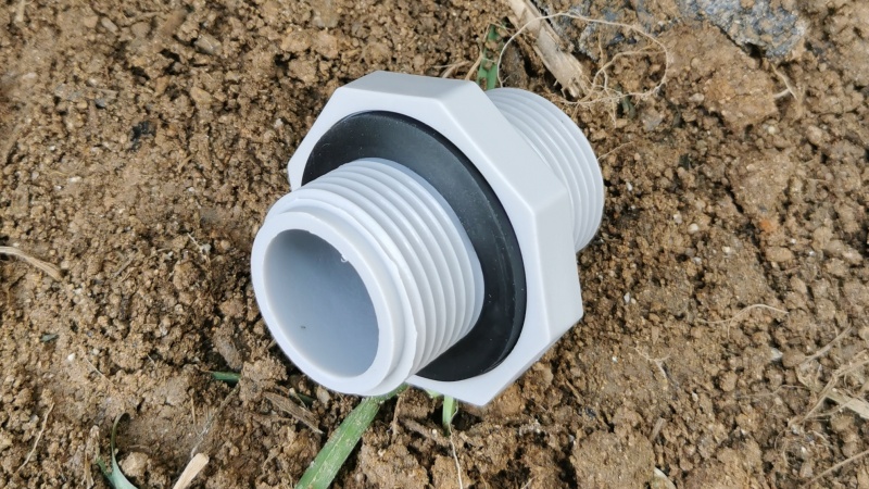 - 続いて用意する部品はこちら。雨水タンクにホースをつなぐソケットです。これが取水口となります。