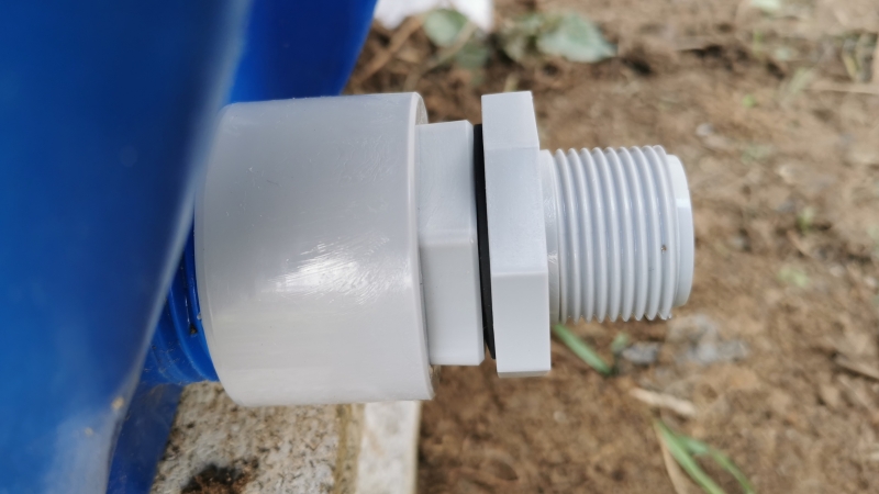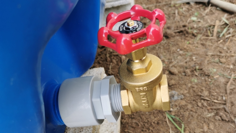 - 雨水タンクの排出口にバルブを取り付ける