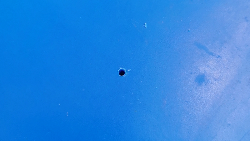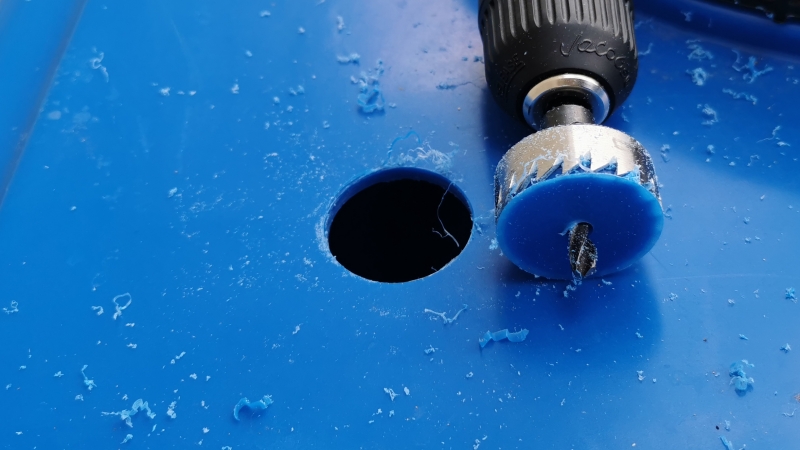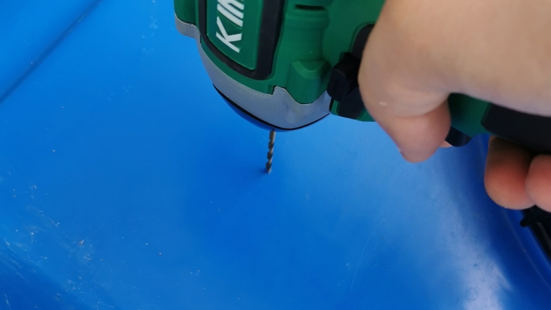 - 取水口を作る位置は、雨水タンクの天井でOKです。位置を決めたら、まずはドリルで小さな穴を開けます。