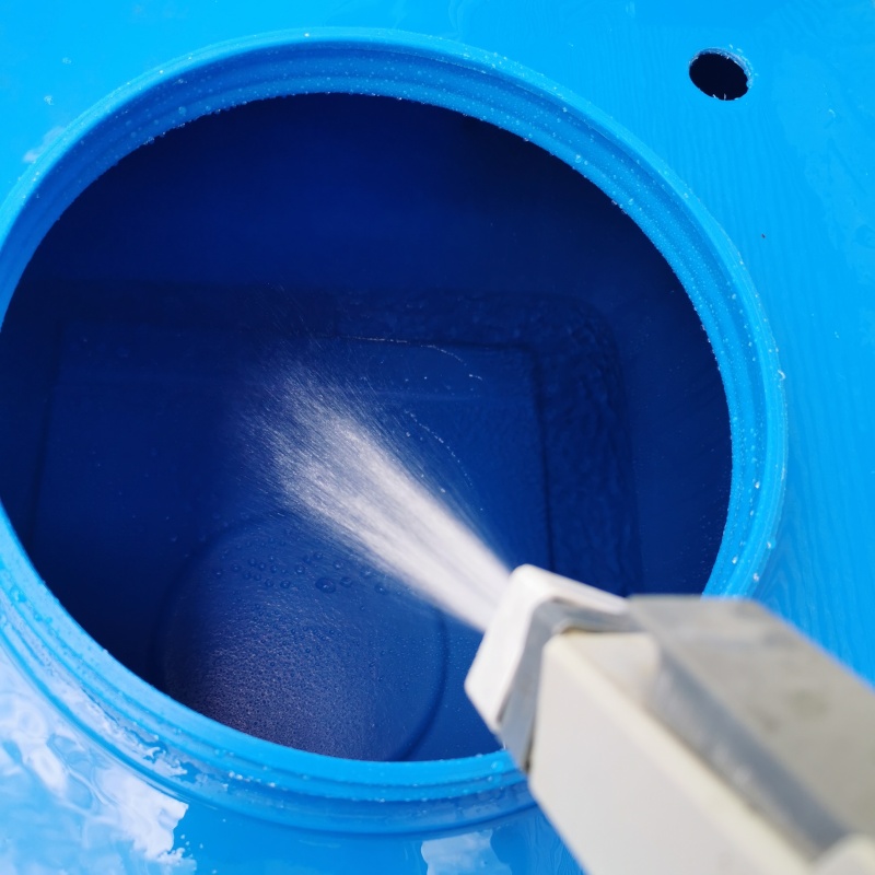 - 飛び散ったゴミをきれいに洗い流します。バルブを開けた状態で雨水タンクを傾けると、ゴミが流れ出ていきます。