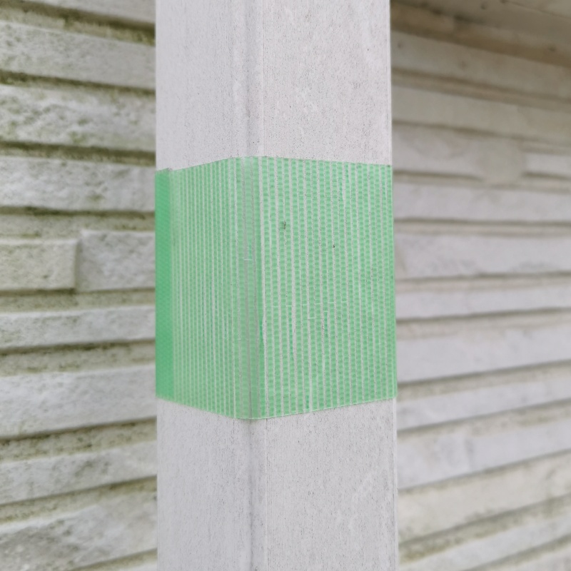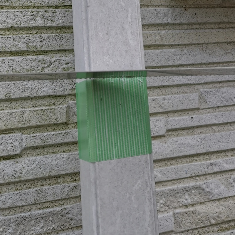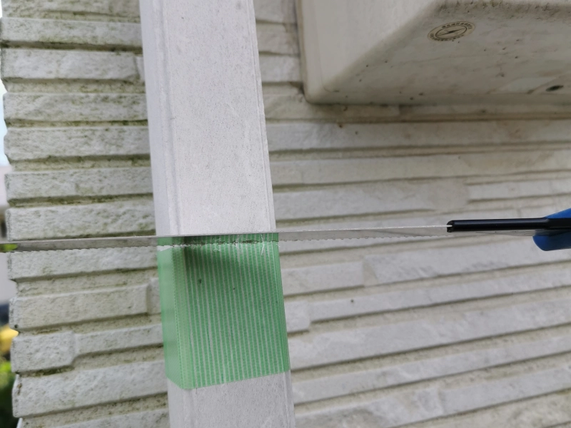 - 集水器の取り付け位置が決まったら、雨樋を切る位置(上部)にマスキングテープで印をつけます。