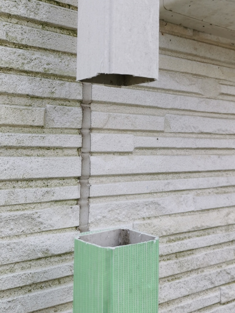 集水器の下に茶色い継手が重なっているのは、雨樋を長く切り取ってしまったからです。