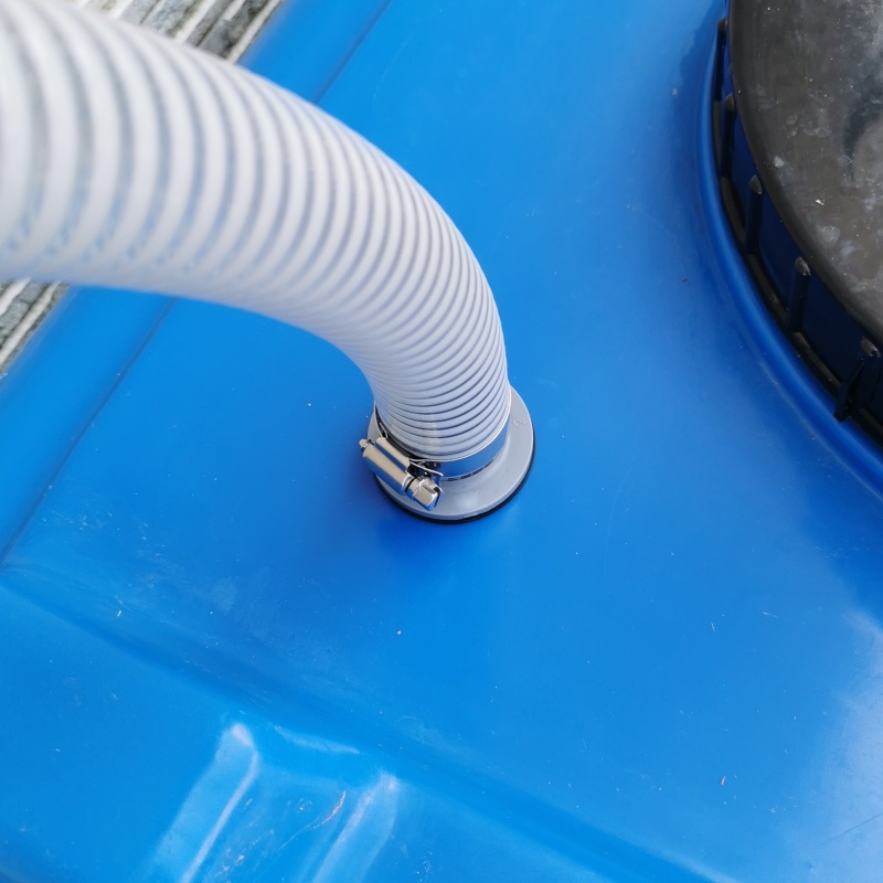 - ホースの先を雨水タンクの取水口につなぎます。ホースが長すぎる場合は、ホースを切って調整してください。