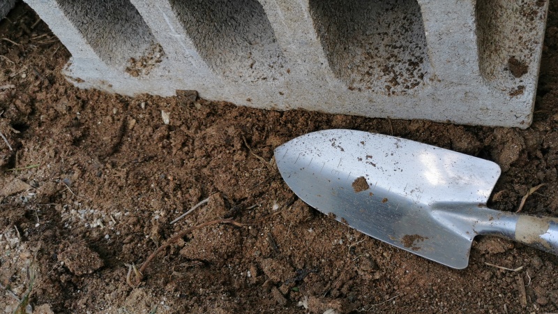 - このように浮いてしまった場合は、ブロックの下に土を盛って調整します。