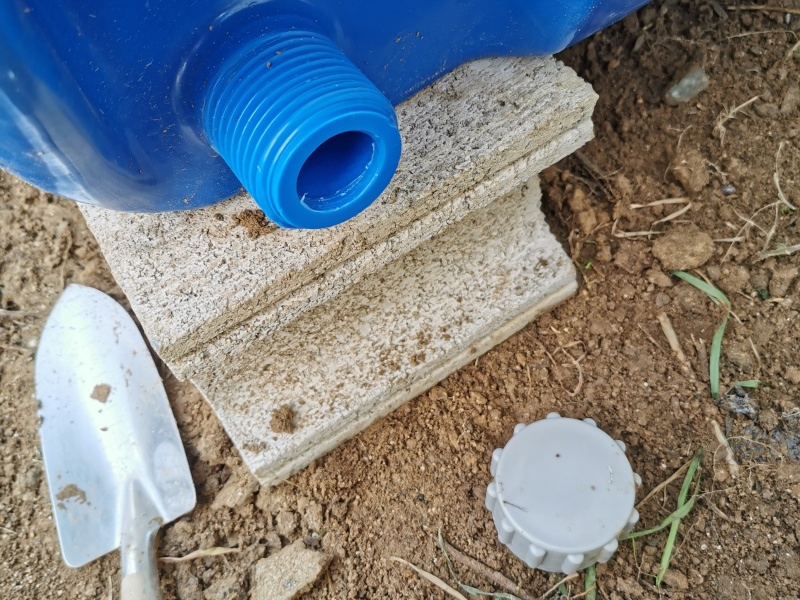 - ブロックの上に雨水タンクを載せます。排出口の向きにご注意ください。