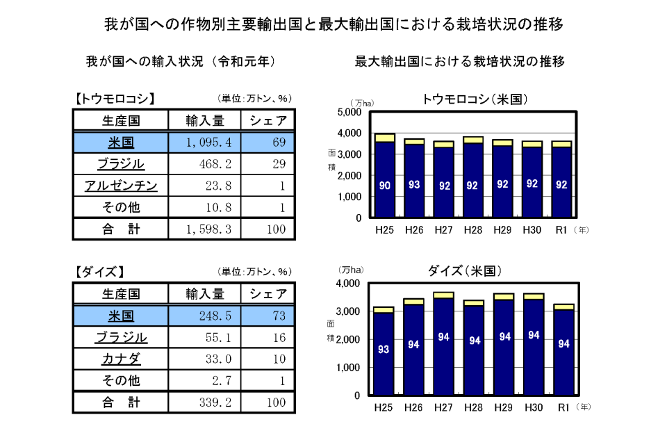 例えば、飼料の主原料であるトウモロコシのほぼ100%が輸入品ですが、栽培面積の90%以上が遺伝子組み換えトウモロコシ。