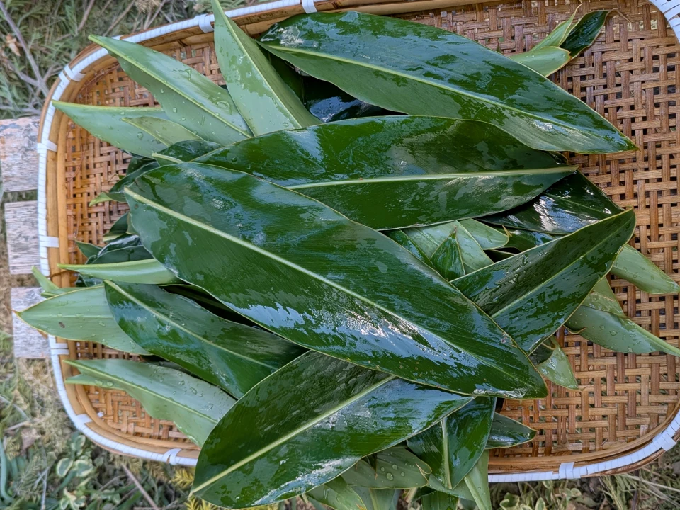 月桃の葉を収穫し、水洗いで汚れを落とします。