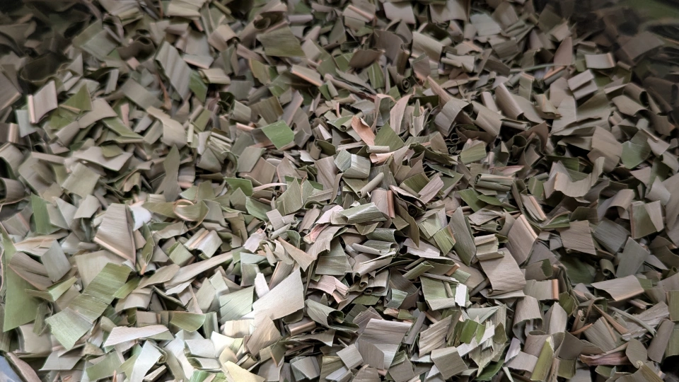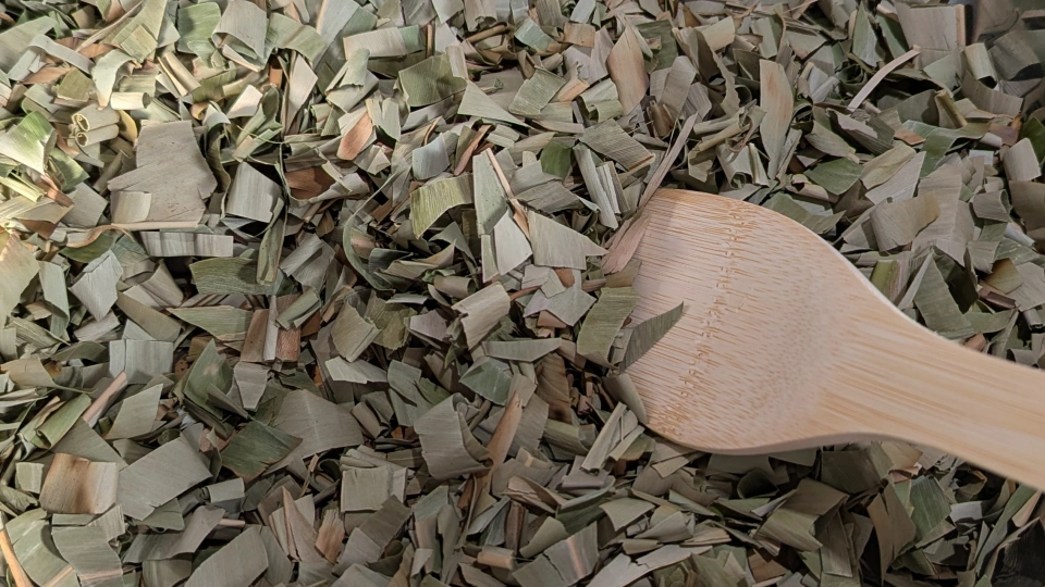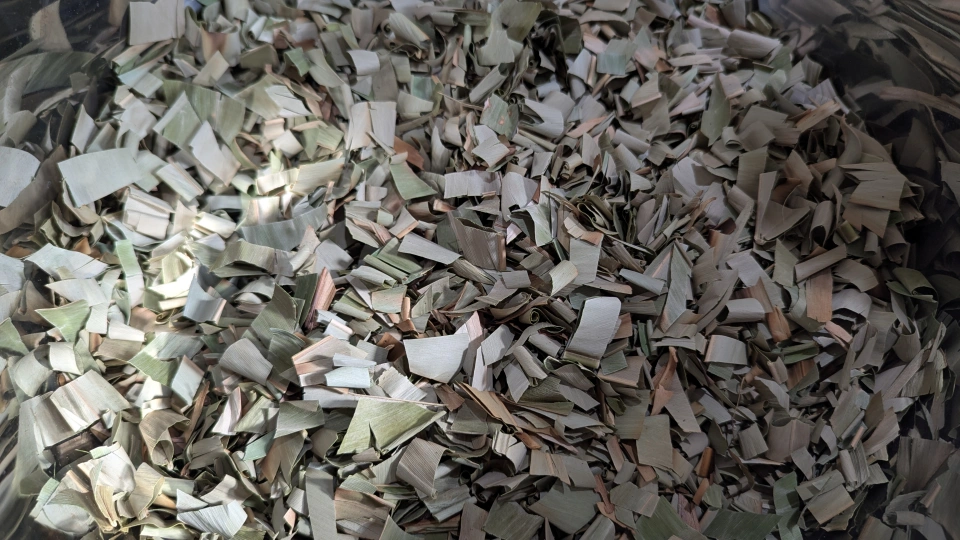 乾燥した月桃の葉をハサミで細かく切ります。香りがものすごく良いです。