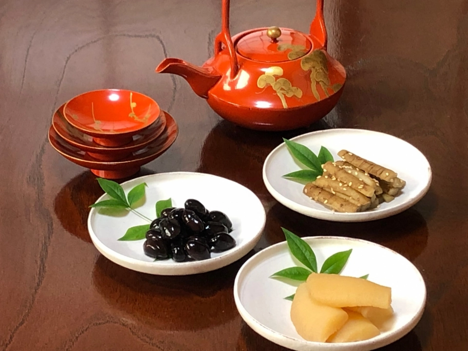 関東では「黒豆・数の子・田作り」、関西では「黒豆・数の子・たたきごぼう」の三品が定番です。