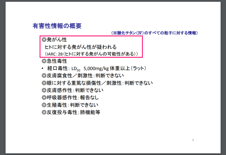 結局は「1例のみであり判断できない」と、酸化チタンのヒトに対する発がん性や毒性については「わからない」というのが見解のようです。