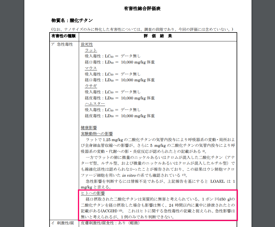 厚生労働省の「有害性総合評価表」という資料を見ると、「経口摂取された二酸化チタンは実質的に無害と考えられている」とあります。