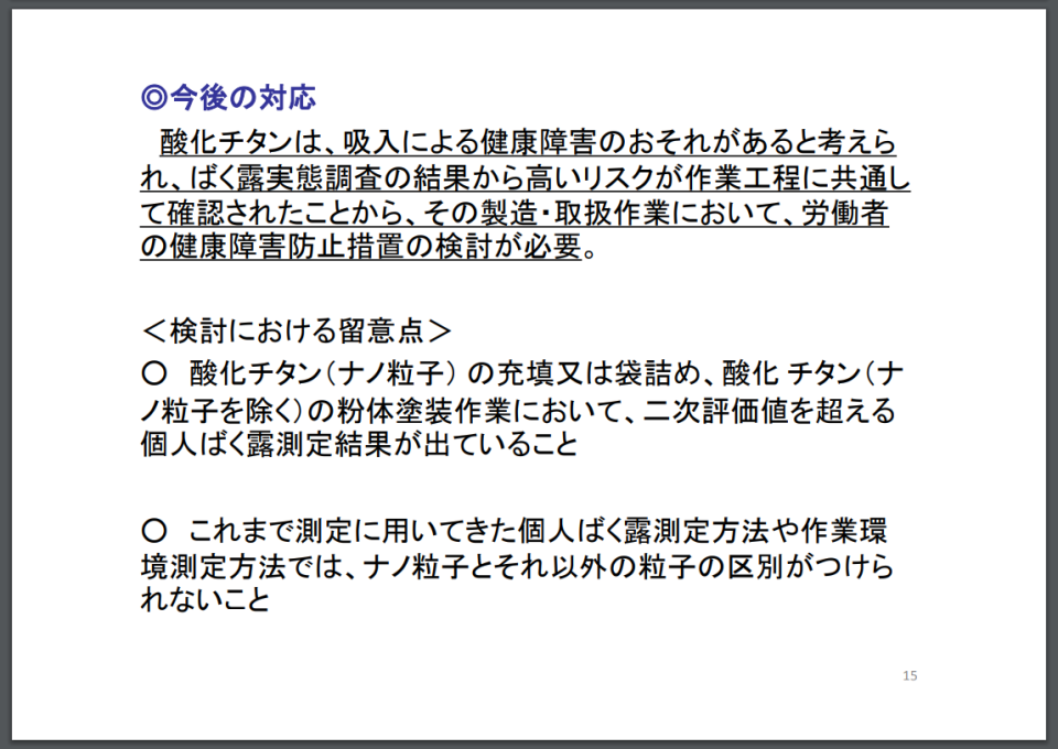 「酸化チタン 発がん性」で検索すると、厚生労働省の「酸化チタン (Ⅳ)の健康障害防止措置について」という資料が出てきました。