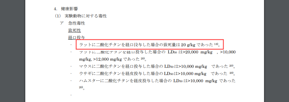 それによると、「ラットに二酸化チタンを経口投与した場合の致死量は 20 g/kg であった」とのこと。