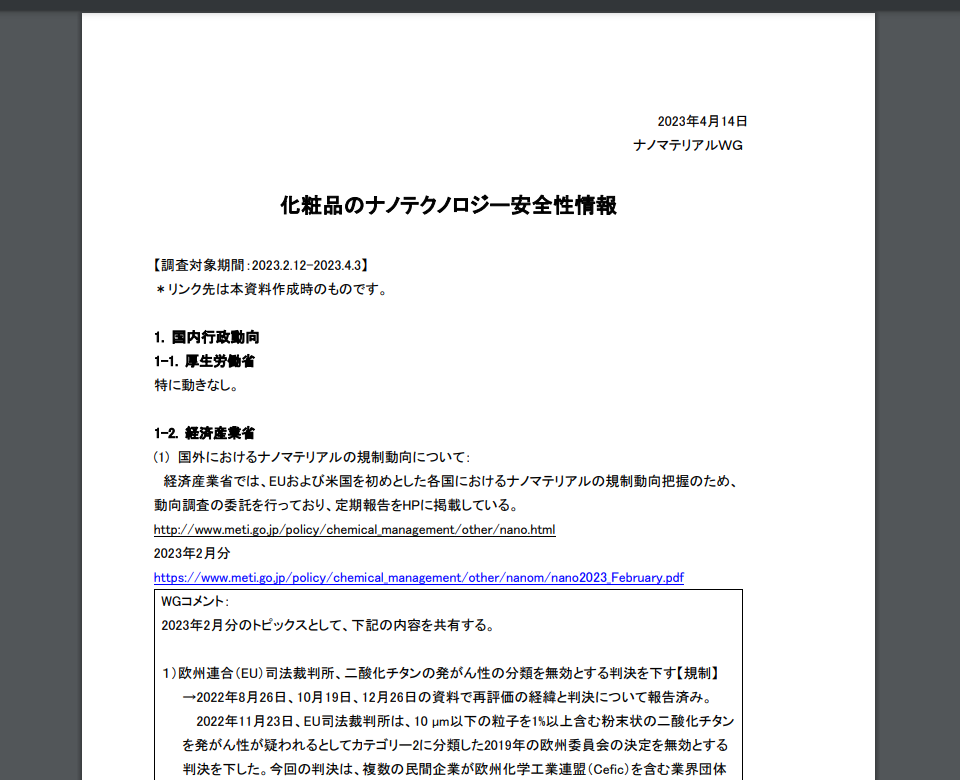 日本化粧品工業会でも2004年からナノマテリアルに関する調査・研究を進め、このような報告書を定期的に発表しています。