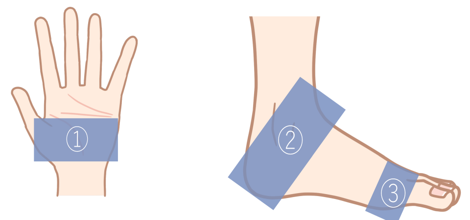 - 上図①~③の面を塗りつぶすように熱の刺激を与える(1回に3~5回、1日数回繰り返す)。