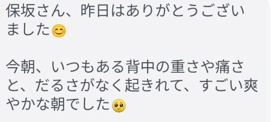 昨日はありがとうございました。眠れないほど痛かった肩甲骨あたりの痛みは10⇨施術後に3まで減り、昨日は、ぐっすり眠れました。