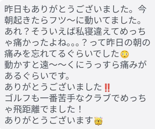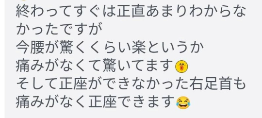 終わってすぐは正直あまりわからなかったですが、今腰が驚くくらい楽というか、痛みがなくて驚いてます。