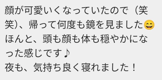 顔が可愛くなっていたので(笑笑)、帰って何度も鏡を見ました。ほんと、頭も顔も体も穏やかになった感じです♪