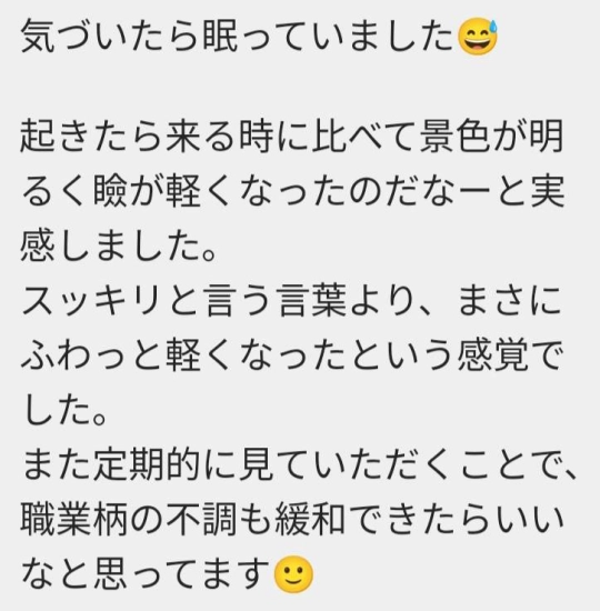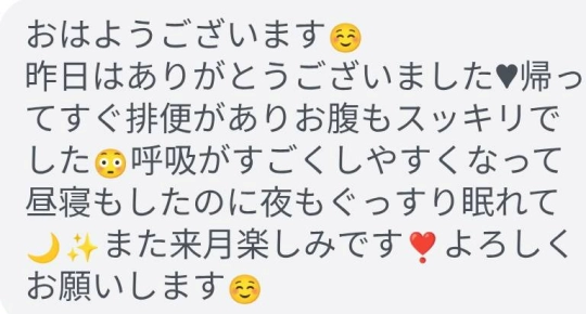 昨日はありがとうございました。帰ってきてすぐ排便がありお腹もスッキリでした。呼吸がすごくしやすくなって昼寝もしたのに夜もぐっすり眠れて。また来月楽しみです。よろしくお願いします。