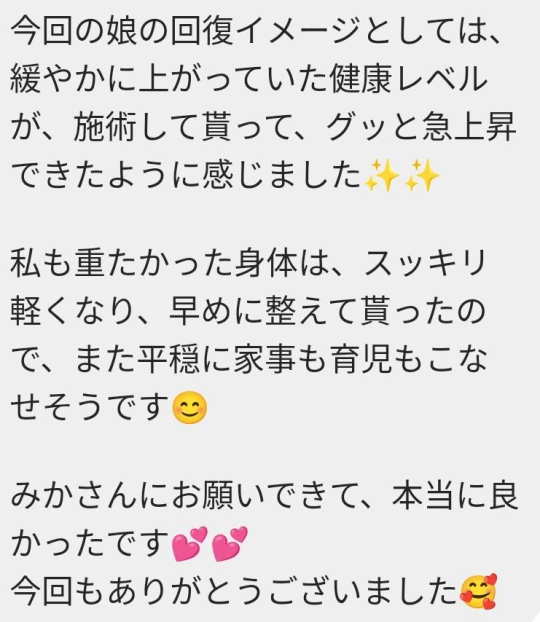 私も重たかった身体は、スッキリ軽くなり、早めに整えてもらったので、また平穏に家事も育児もこなせそうです。