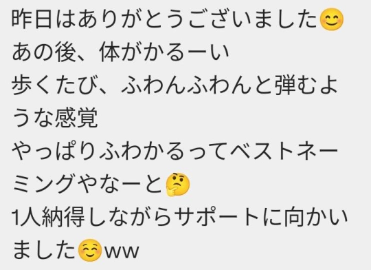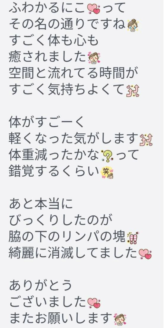 ふわかるにこって、その名の通りですね。すごく体も心も癒されました。空間と流れてる時間がすごく気持ちよくて、体がすごーく軽くなった気がします。体重減ったかな?って錯覚するくらい。