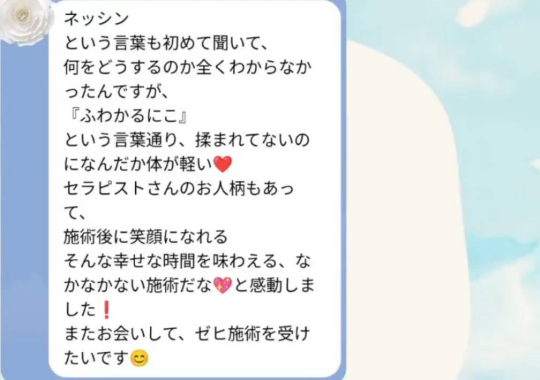 施術直後は、ネッシンの効果はハッキリとは分からなかったのですが、横になれたリラックス感やスッキリ感がありました。そしてあの後、すごく気分よく過ごせたんです。