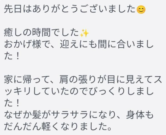 セラピストさんのお人柄もあって、施術後に笑顔になれる、そんな幸せな時間を味わえる、なかなかない施術だな、と感動しました!